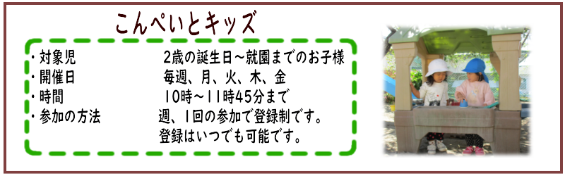 お子様の集団活動の練習に、またお母様方の交流の場として♪2歳児から満3歳(こんぺいとキッズ)までのお子様と、その保護者の皆様を対象に、子育て支援教室を開催しています。親子で楽しく活動しながら、お子様が集団活動に慣れる場として、またお母さん同士の交流の場として気軽にご参加下さい。又、月見ケ丘幼稚園は1歳になったら利用できる「いっぽクラブ」の子育て支援もがあります。場所は「こんぺいとキッズ」も「いっぽクラブ」も月見ケ丘幼稚園、別棟の「桜館」で行っています。専任の2人の先生が保育致します。ぉ問い合わせは桜館 ℡52-0260(9:30~14:00)14:00以降は、月見ケ丘幼稚園℡51-1748までお問い合わせください。