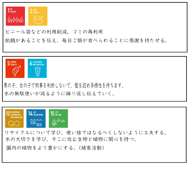 毎日の保育の中で絵本や映像を通して理解させたり、SDGSコロちゃんカルタ遊びや、NHKのSDGs番組「17項目のおぼえ歌」を通して楽しく理解できるように取り組んでいます。